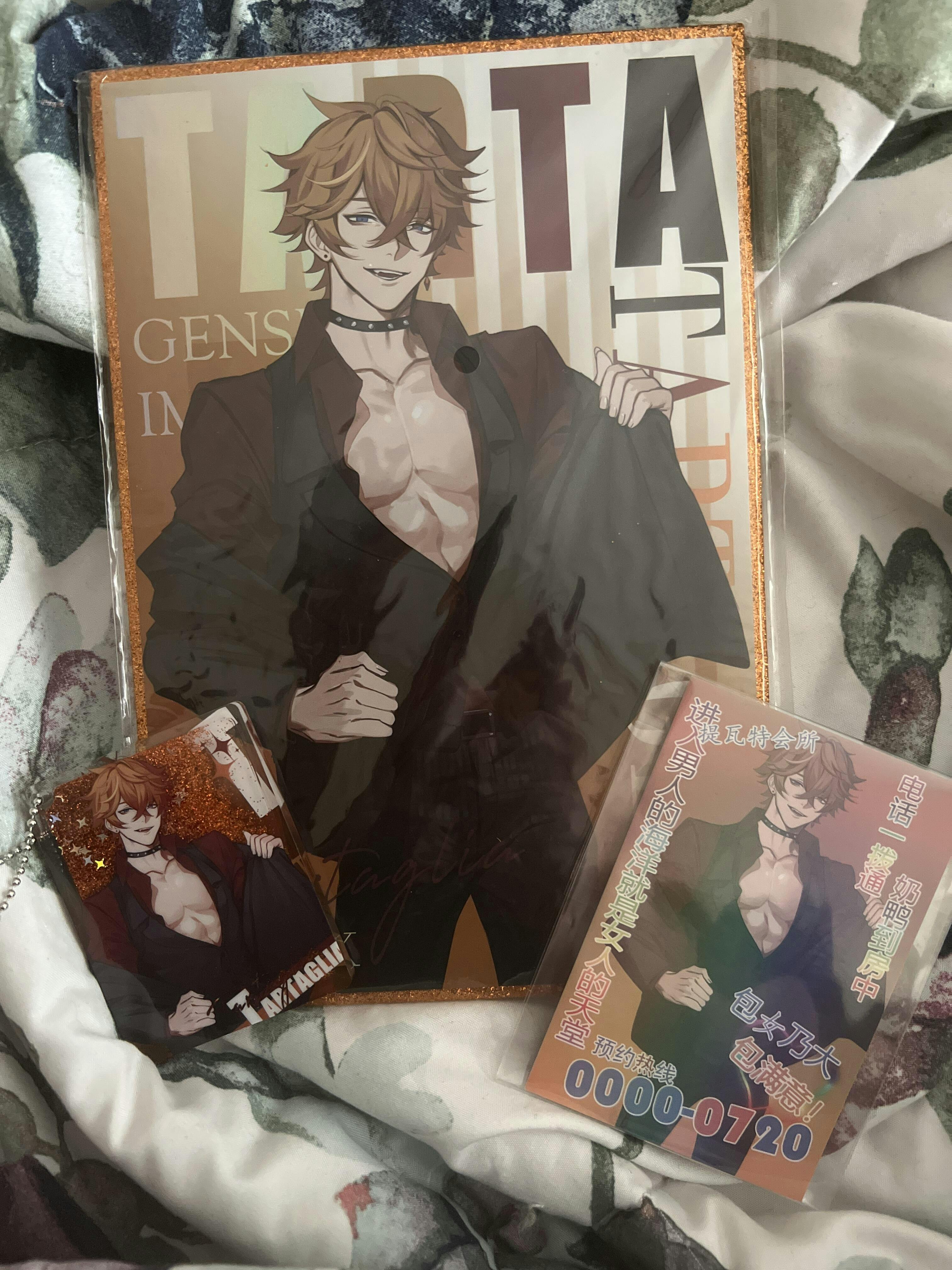 Fanmade merchandise featuring fanart of Genshin Impact characters, Ayato, Diluc, Itto, Kaeya, Tartaglia, Xiao, and Zhongli as part of the Addicted series.