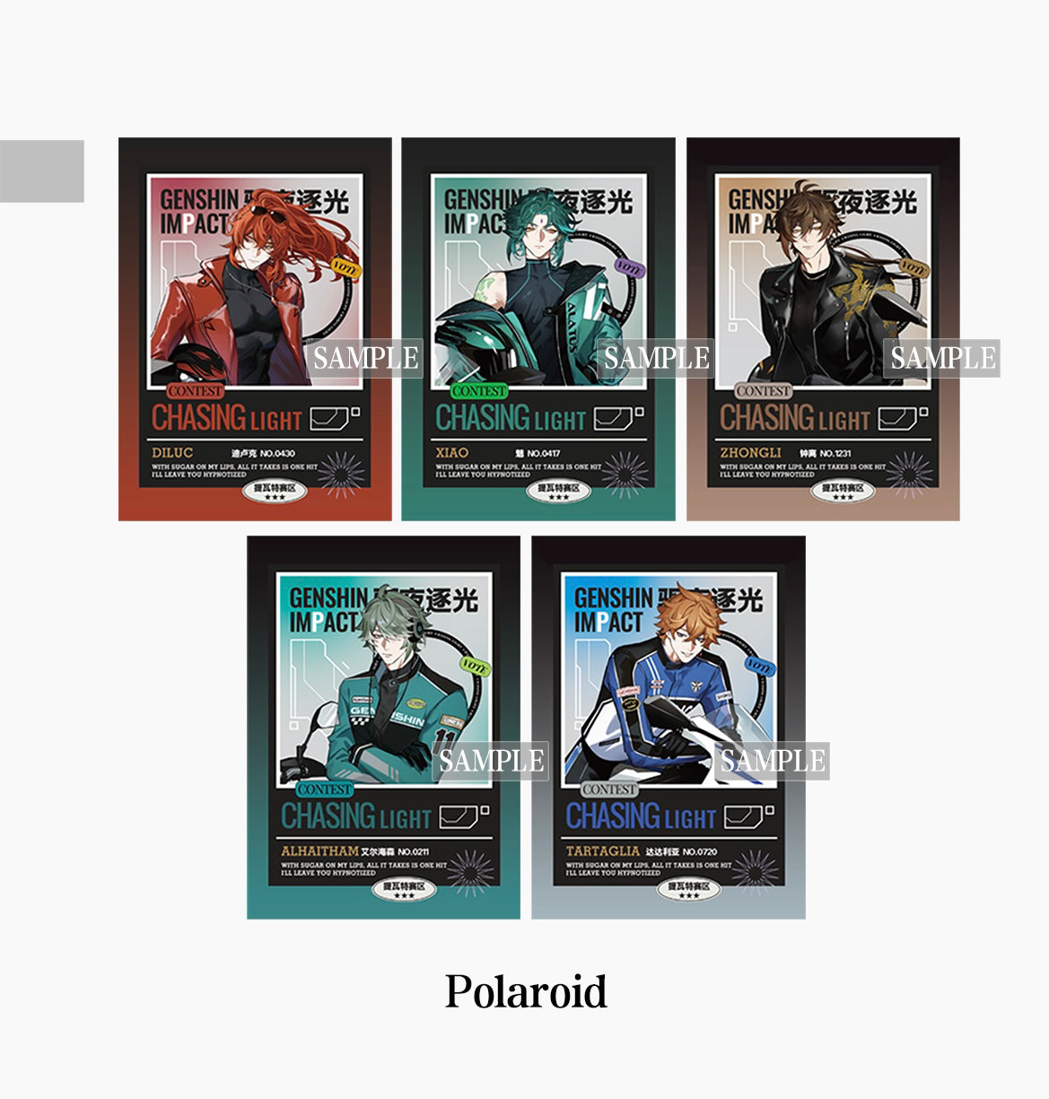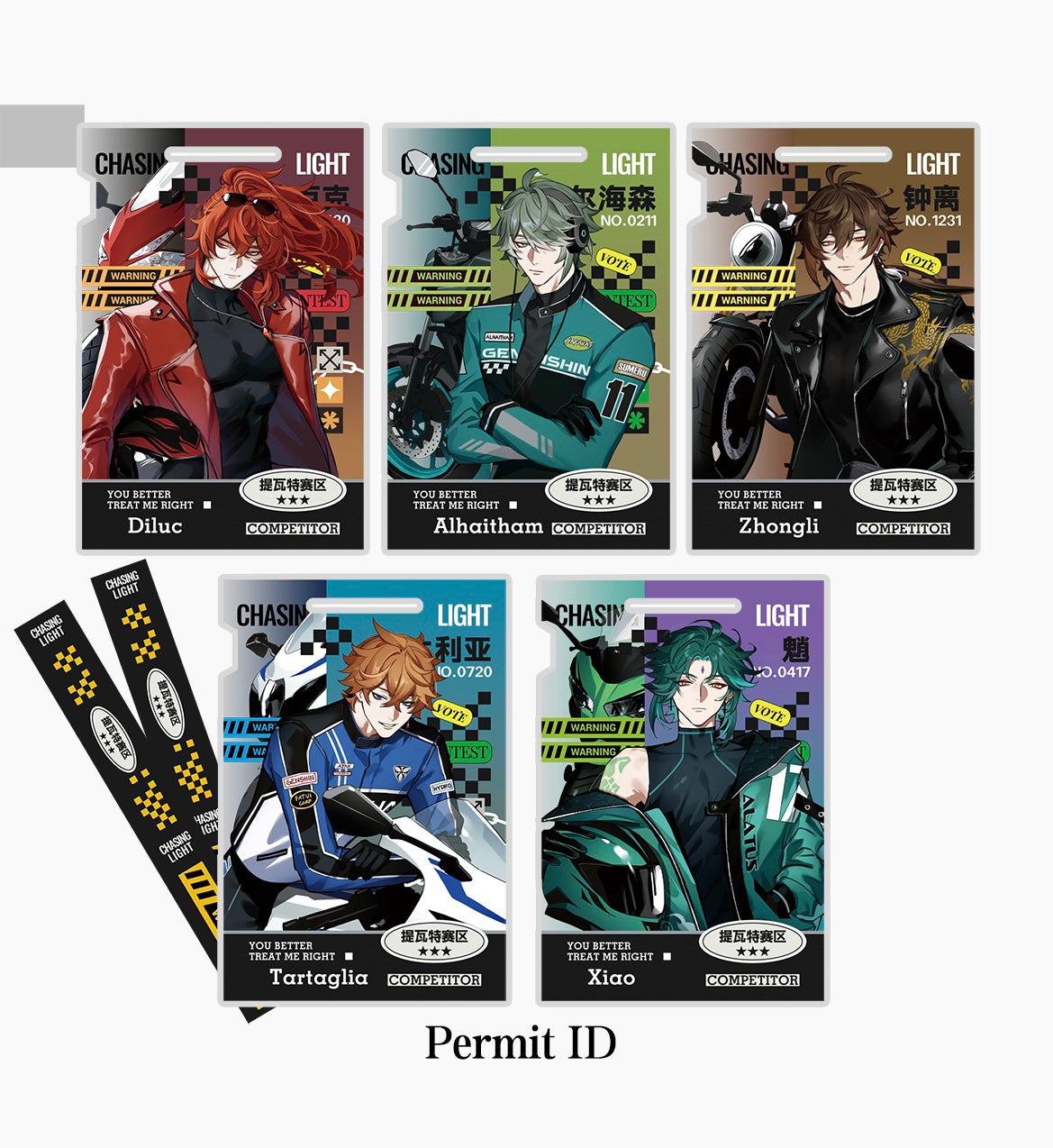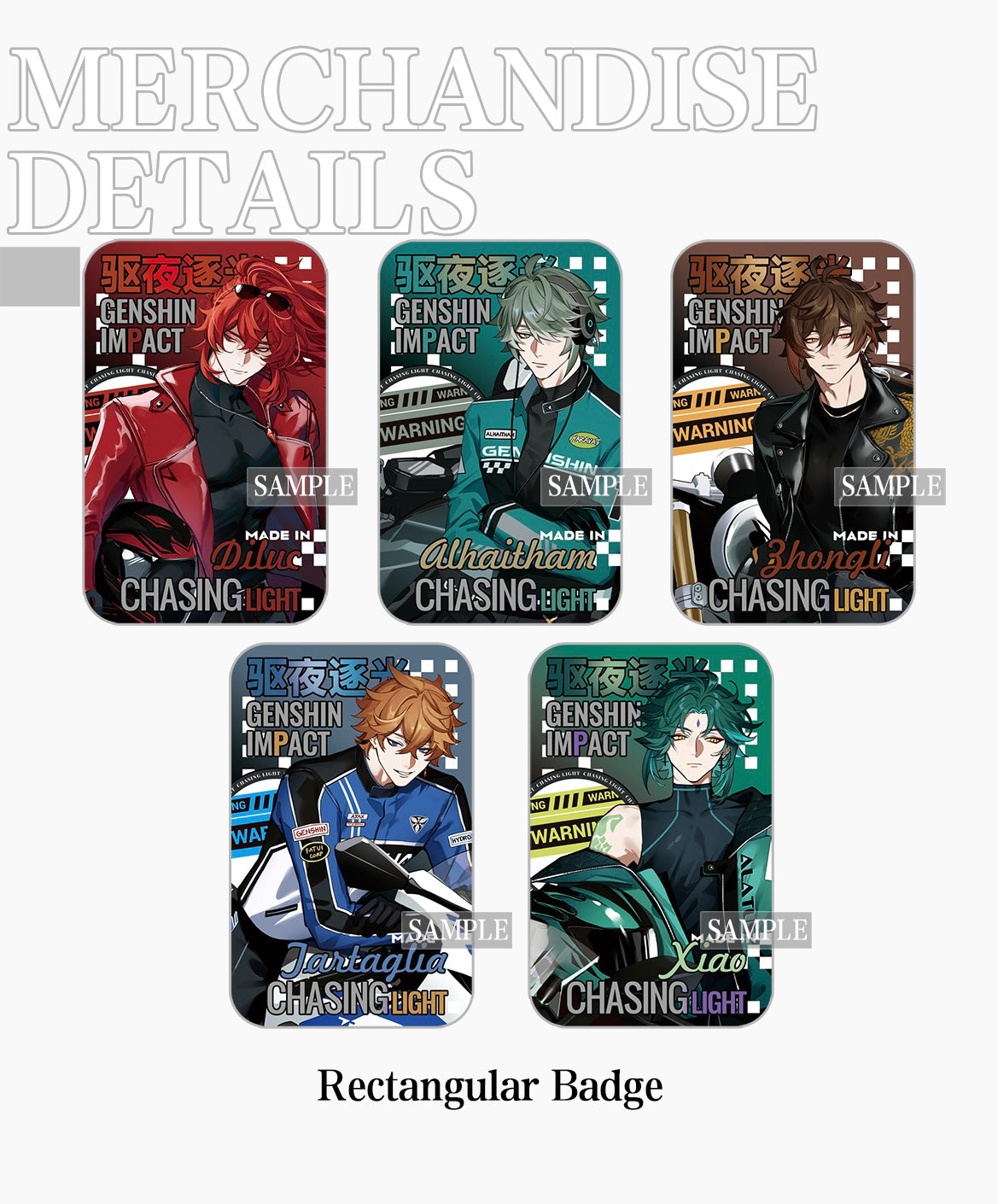Fanmade merchandise featuring fanart of Genshin Impact characters, Alhaitham, Diluc, Tartaglia, Xiao, and Zhongli as part of the Chasing Light series.