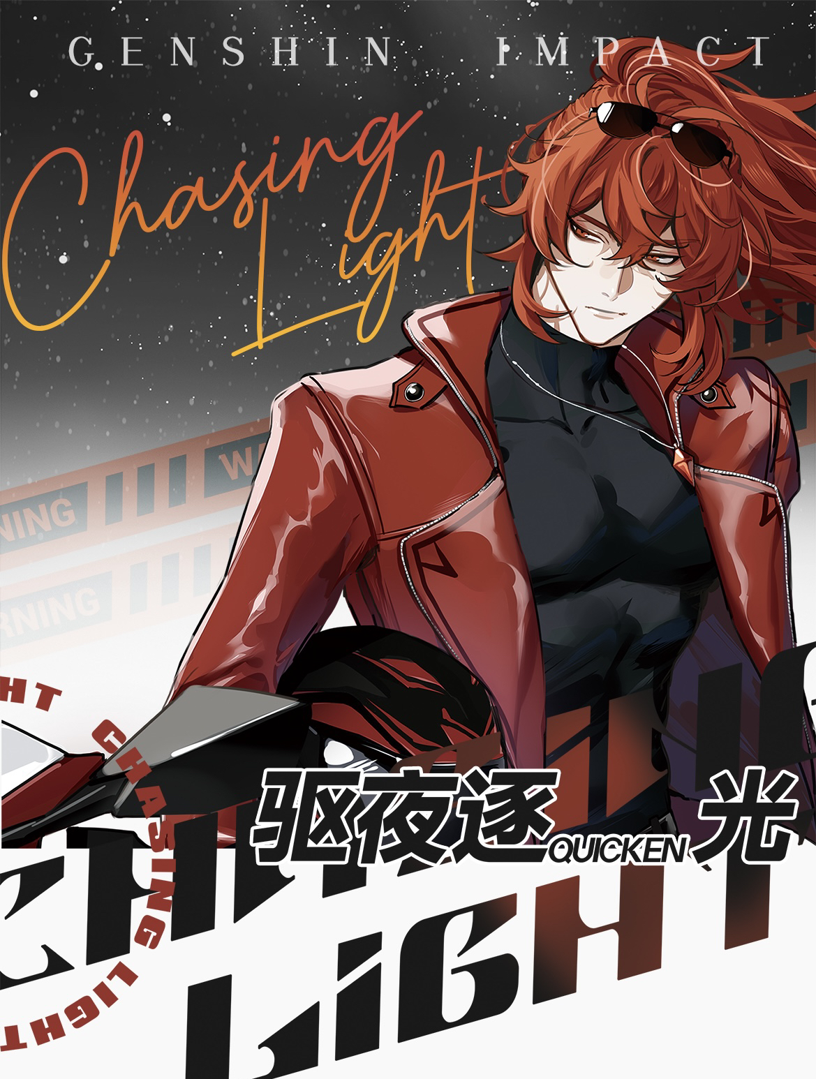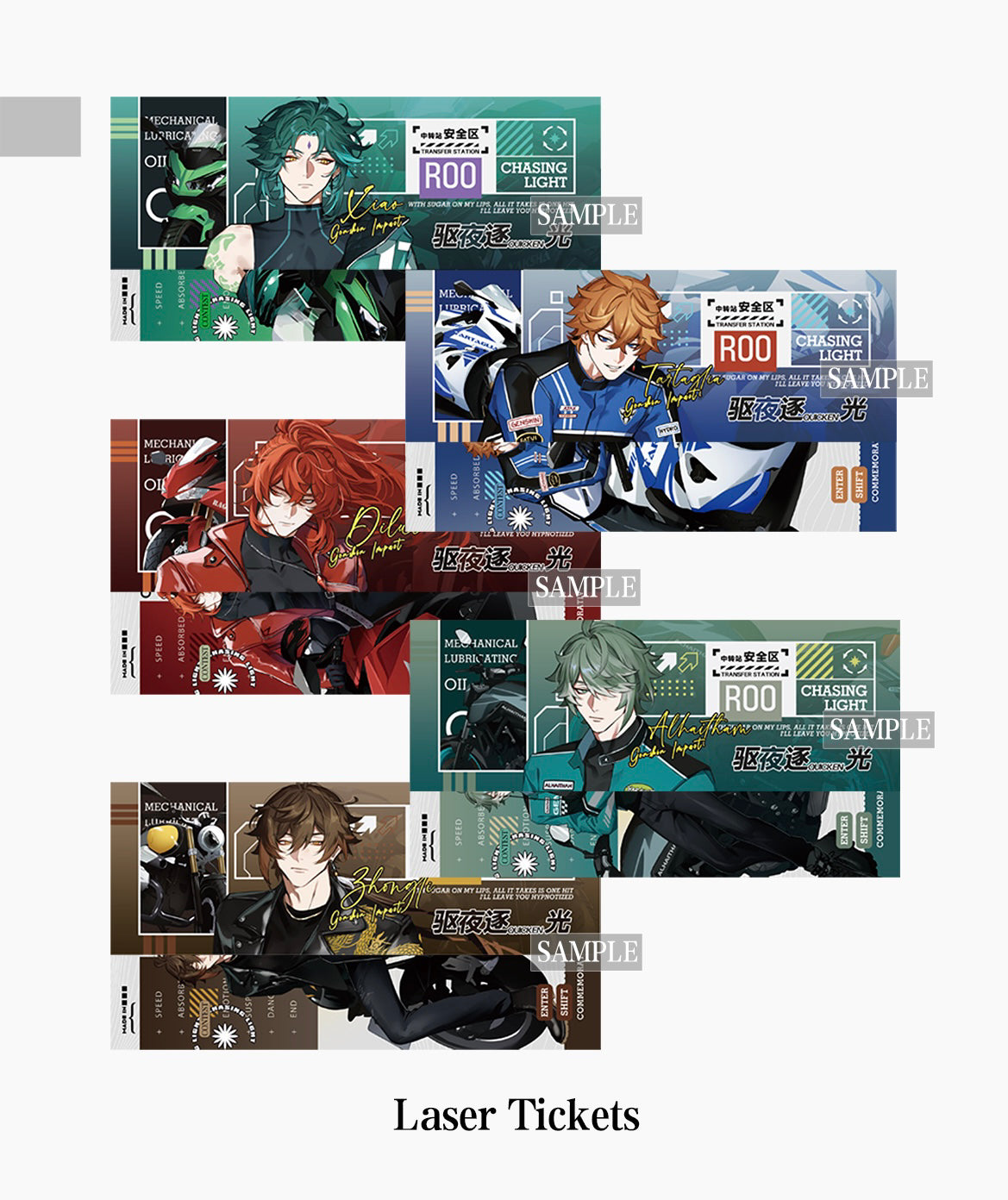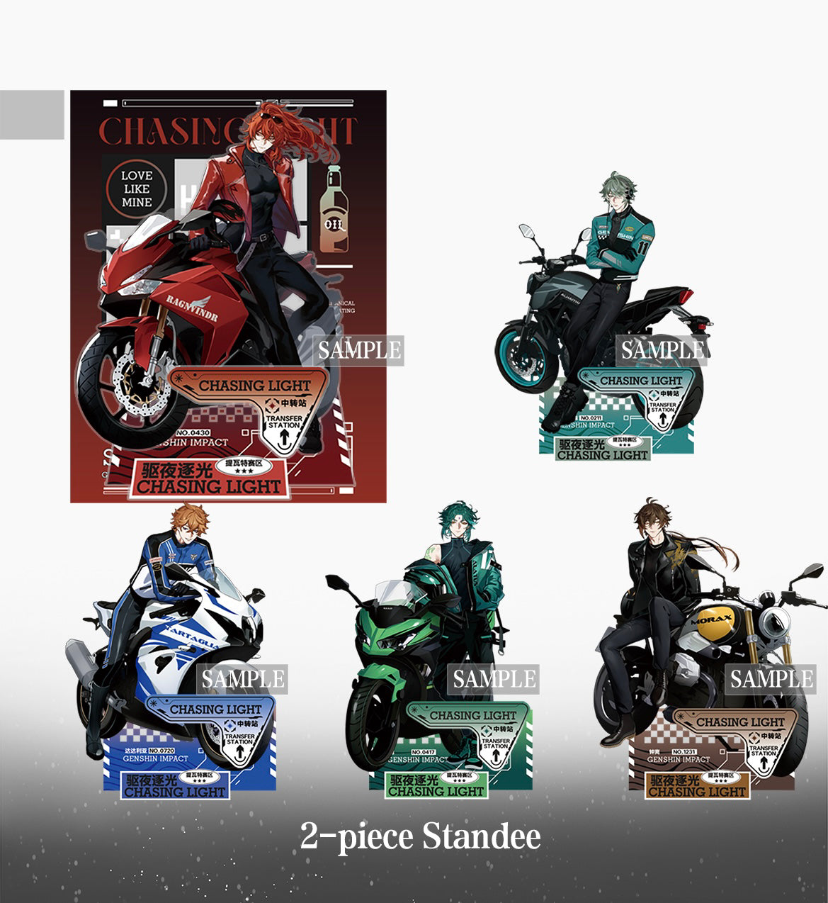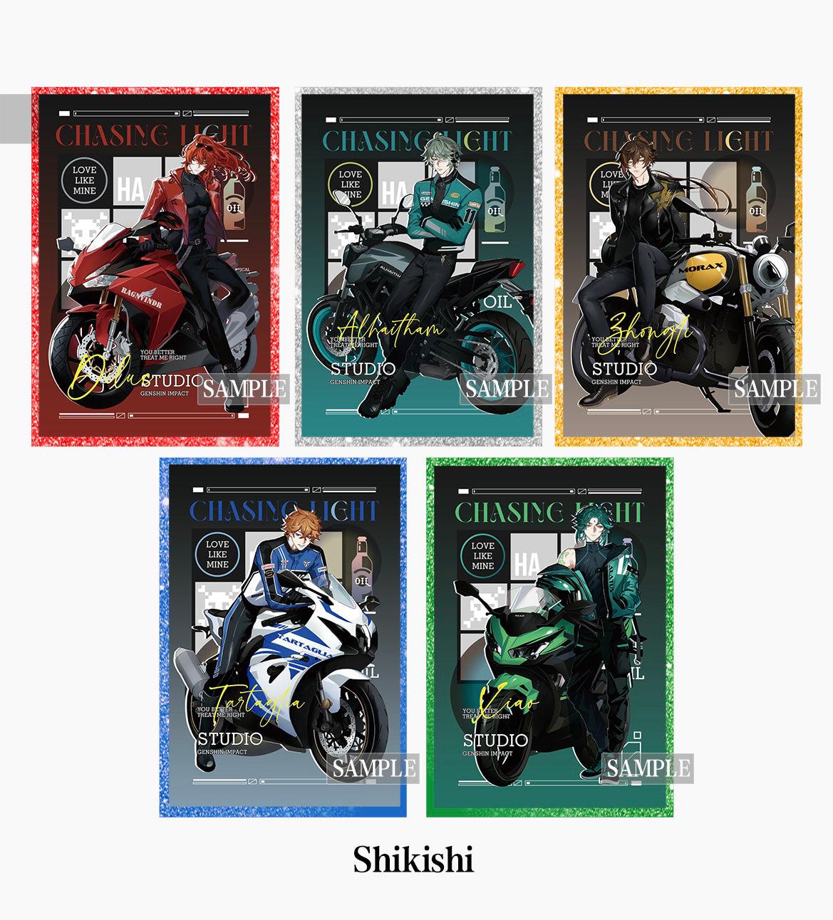 Fanmade merchandise featuring fanart of Genshin Impact characters, Alhaitham, Diluc, Tartaglia, Xiao, and Zhongli as part of the Chasing Light series.